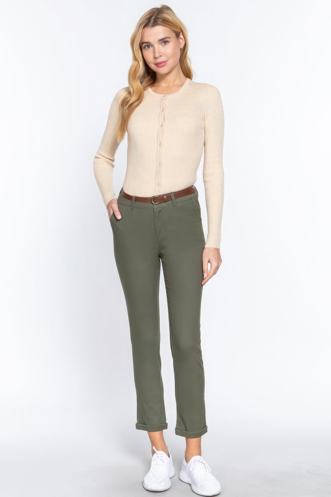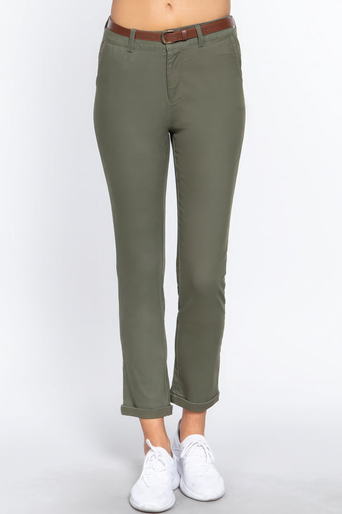 Enhance your wardrobe with the Cotton Spandex Twill Long Pants with Belt in Olive Oil. Add them to your cart now and experience the perfect blend of fashion and comfort!