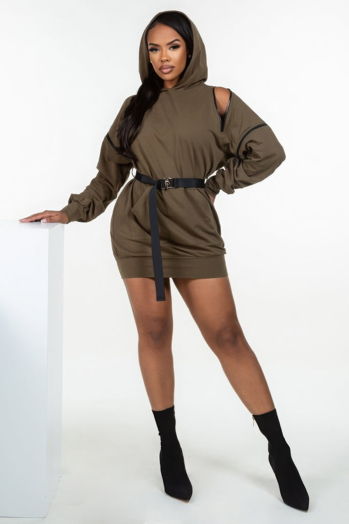 - "I love my Olive Long Sleeve Hooded Mini Dress! The double zipper detail is so trendy, and the detachable sleeves are a game-changer." - A. M.