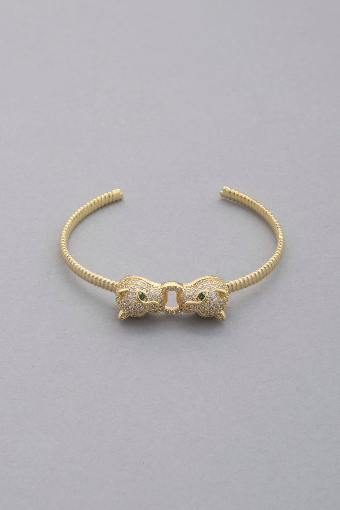 Experience the perfect blend of fierceness and sophistication. Our double leopard head metal bangle bracelet is a bold accessory that effortlessly enhances your wrist with a touch of wild charm.