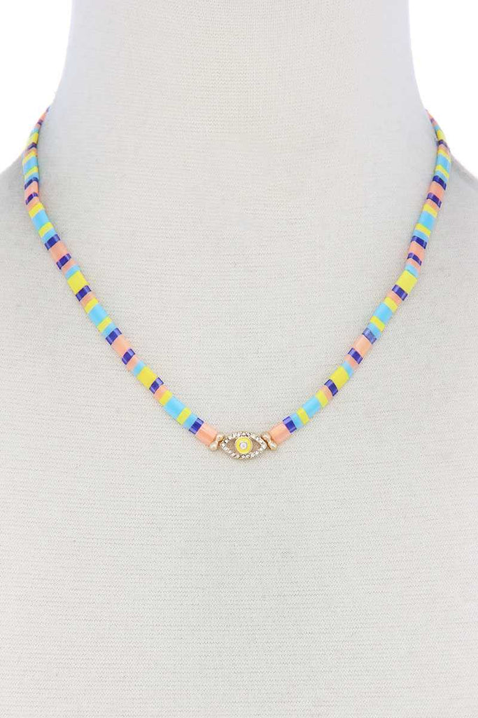 Perfect for casual outings or adding a bohemian touch to your everyday style, the Evil Eye Charm Color Block Necklace complements a variety of looks.