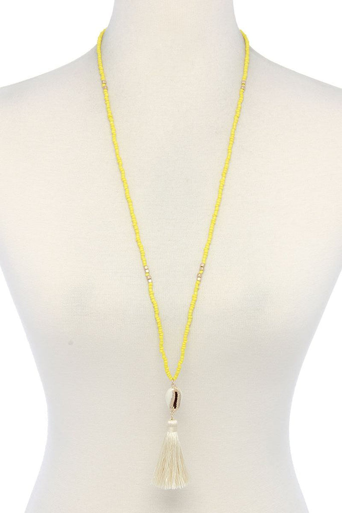 Add our Cowrie Shell Tassel Beaded Necklace in Pink, Coral, or Yellow to your cart now and elevate your style with the allure of beach-inspired accessories!