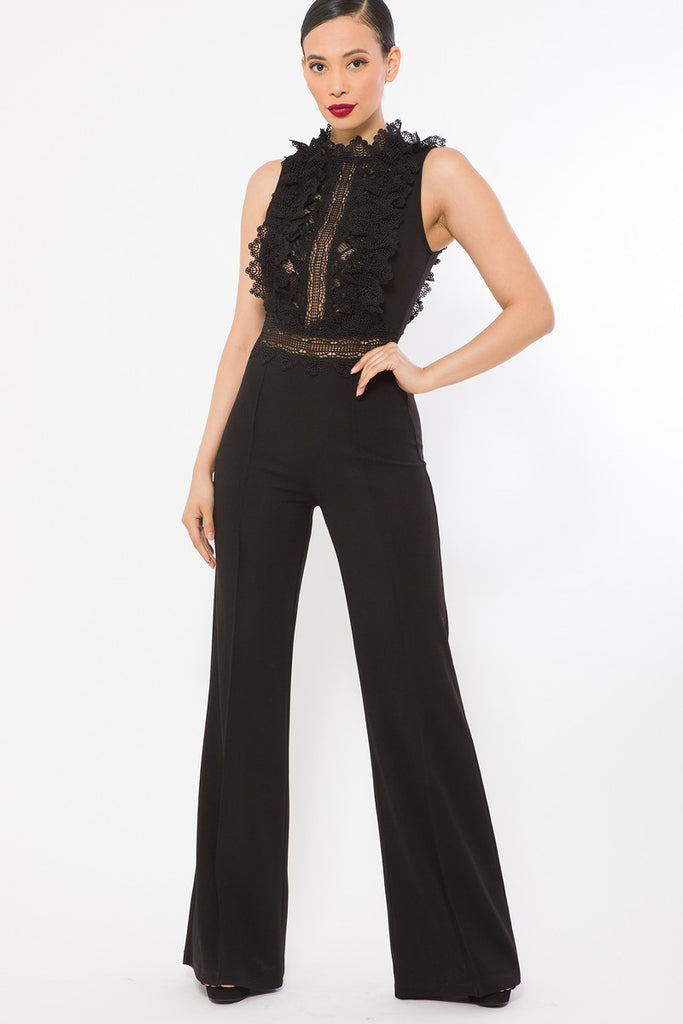 • Stylish Details: The crochet lace combined bodice, mock neck, and frontline flared leg design make this jumpsuit a statement piece.
