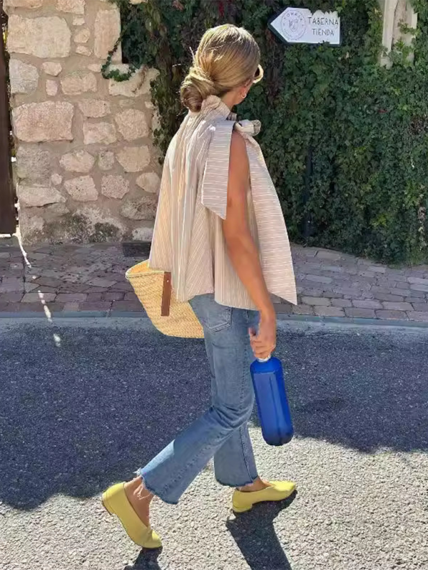 Women's new casual striped solid color rubber band drawstring straight leg pants