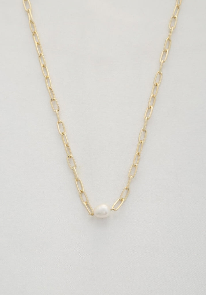 "The Pearl Bead Oval Link Necklace is a classic beauty! The pearl beads are lustrous, and the oval links add a modern touch. I wear it for special occasions and with casual outfits—it's so versatile and elegant." - E. C.