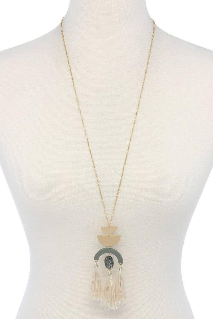 Introducing our Half Circle Metal Tassel Pendant Necklace, a chic accessory available in a stylish color palette: Red, White, and Mint. This necklace features a contemporary half-circle pendant with tasteful metal tassel details, adding a touch of modern sophistication to your ensemble.