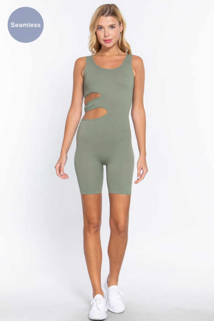 Make a fashion statement with our Suave Cut-out Seamless Romper in Sage Green. Add it to your cart now and elevate your modern chic wardrobe!