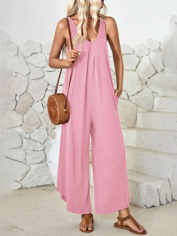 Casual sleeveless V-neck wide-leg jumpsuit with pockets