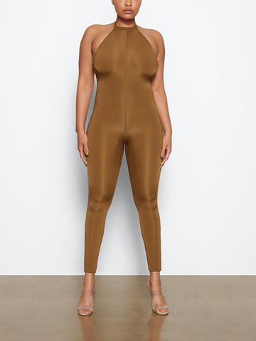 Women's solid color casual sleeveless hanging neck jumpsuit