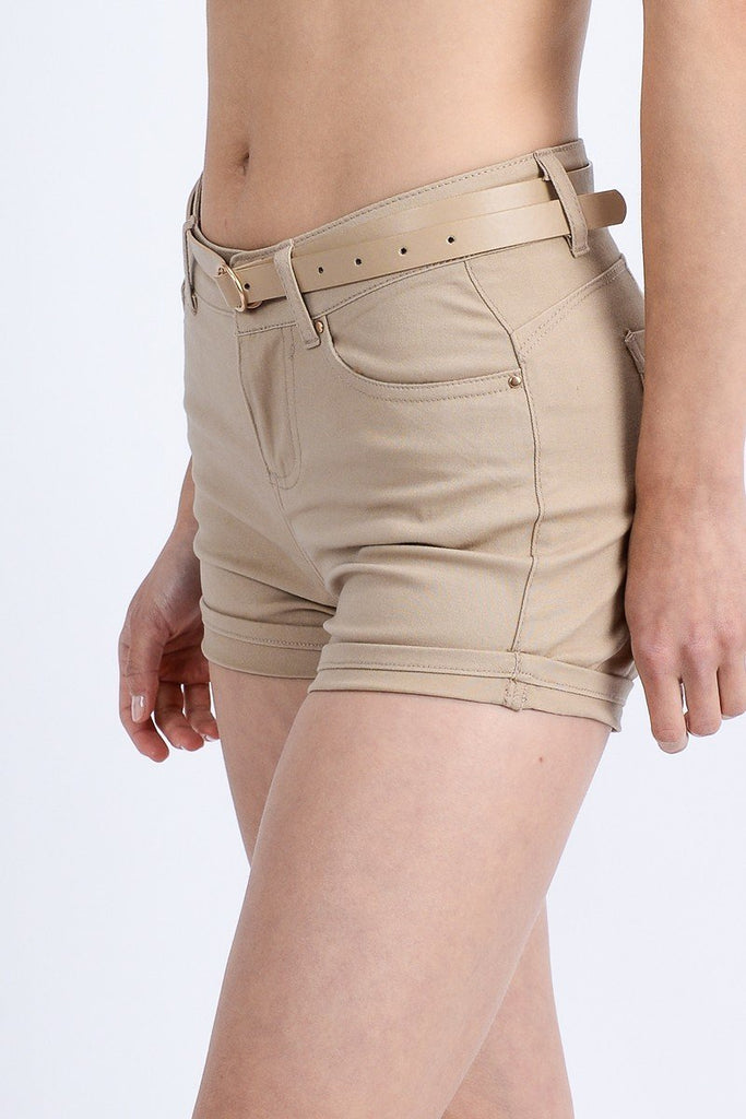 Make a statement with these classic High Rise 5 Pockets Roll Up Hem Shorts featuring a Khaki hue, roll-up hem, and included belt. The shorts are perfect for summer days, offering both style and comfort.