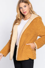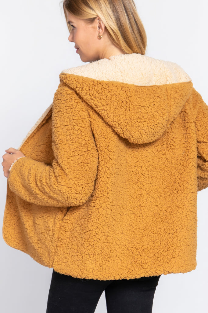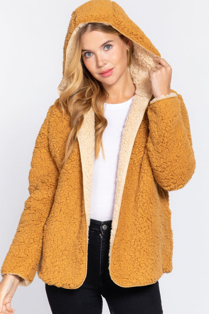 Elevate your style with the Hoodie Faux Fur Reversible Jacket in Mustard/Butter. Add it to your cart now and experience the perfect combination of fashion and comfort!
