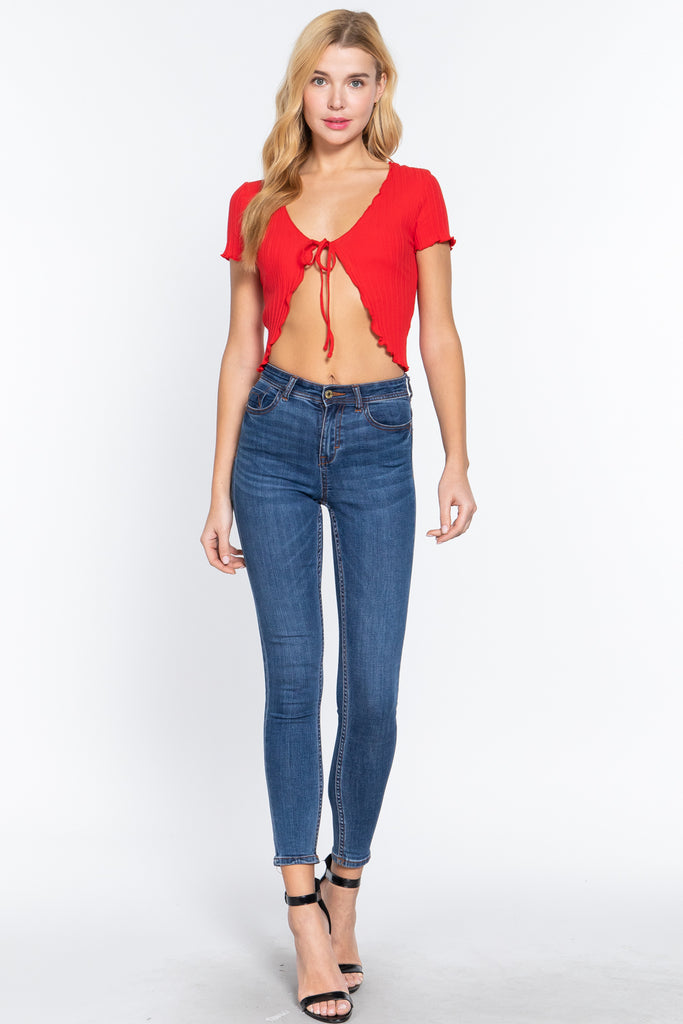 Discover the perfect blend of fashion and comfort that sets this cardigan apart. Embrace the short sleeve design, front tie detail, and lettuce edge trim for a chic and trendy look.