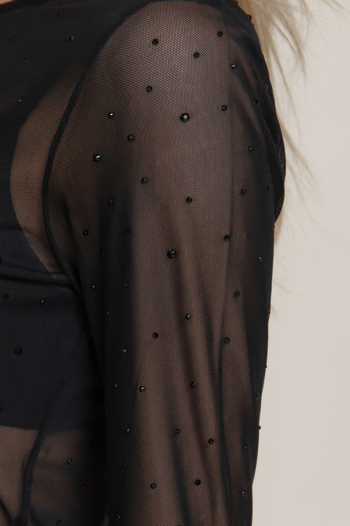 Comfortable All-Day Wear: The Long Sleeve Round Neck Mesh with Rhinestone Top is designed for all-day comfort, effortlessly transitioning from day to evening.