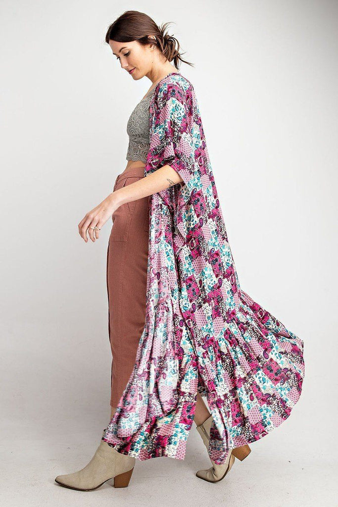 Whether you're heading to the beach, a music festival, or a casual day out, the Rayon Challis Ruffle Bottom Maxi Open Kimono in Hot Pink is a versatile and stylish choice.