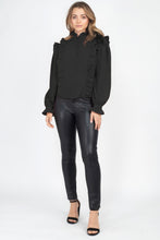 This top stands out with its unique blend of sophistication and contemporary design. The mock neckline and ruffle trim add a touch of femininity, while the buttoned front provides a classic and polished finish.