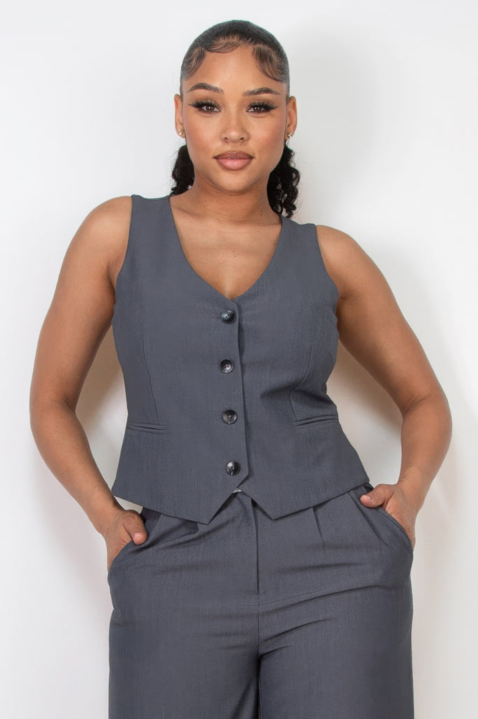 Elevate your wardrobe with our Buttoned Solid V-Neck Vest Top, a sleek and stylish addition perfect for any occasion. The V-neckline and button-down closure bring a touch of sophistication, while the welt pockets add both style and functionality.