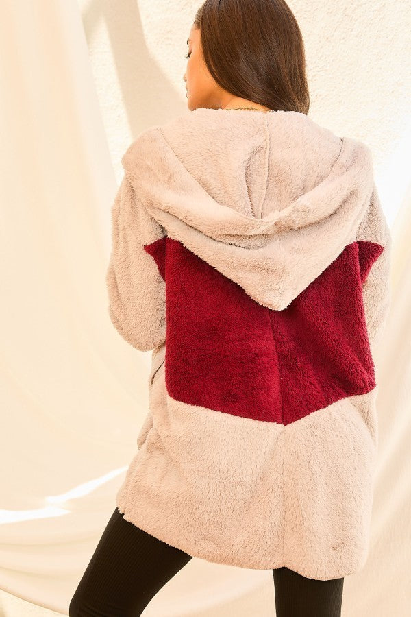 Add the Color Block Long Sleeve Wool Hoodie Jacket in Grey/Burgundy to your cart now and experience the perfect blend of fashion and comfort!