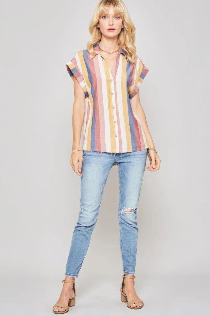 Experience the perfect blend of comfort and contemporary style. Our woven shirt sets itself apart with the vibrant multicolor stripes and the unique details like the pleated back and frayed hem. It's not just a shirt; it's a fashion statement that showcases your individuality.