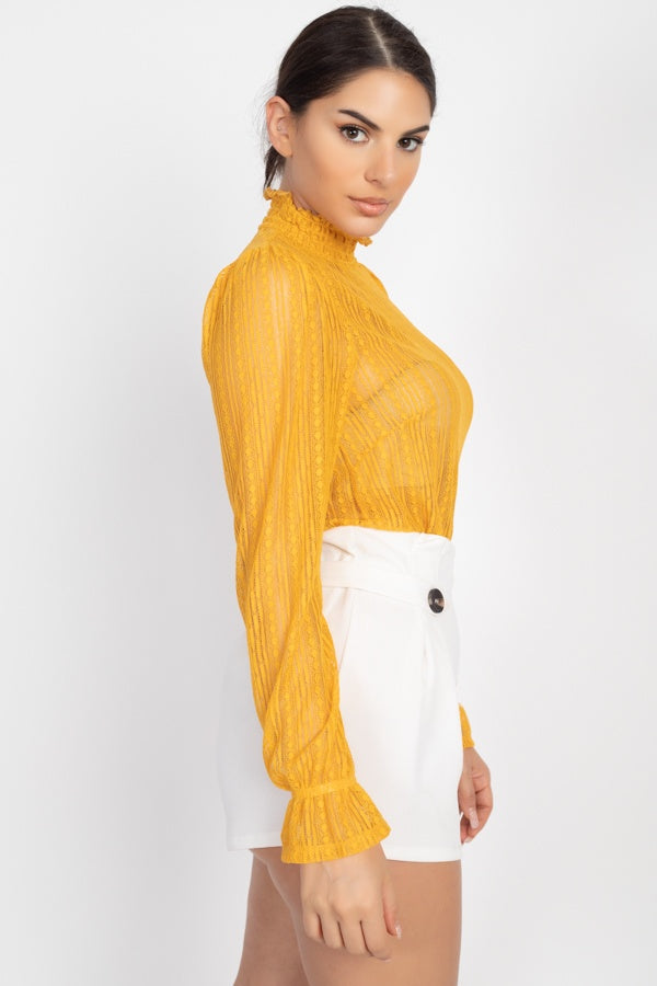 Add our Ruffle Mock Neck Lace Top in Mustard to your cart now and embrace timeless elegance with a touch of modern flair!