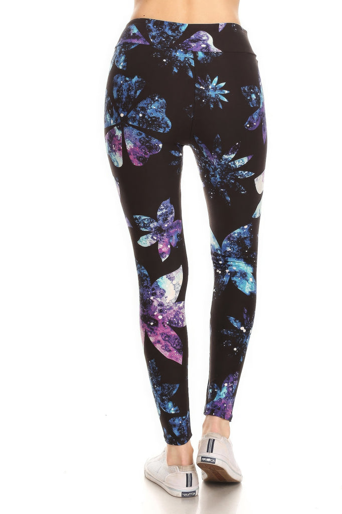 4. Print: The multi-colored galaxy silhouette floral print adds a celestial and eye-catching element to these leggings.